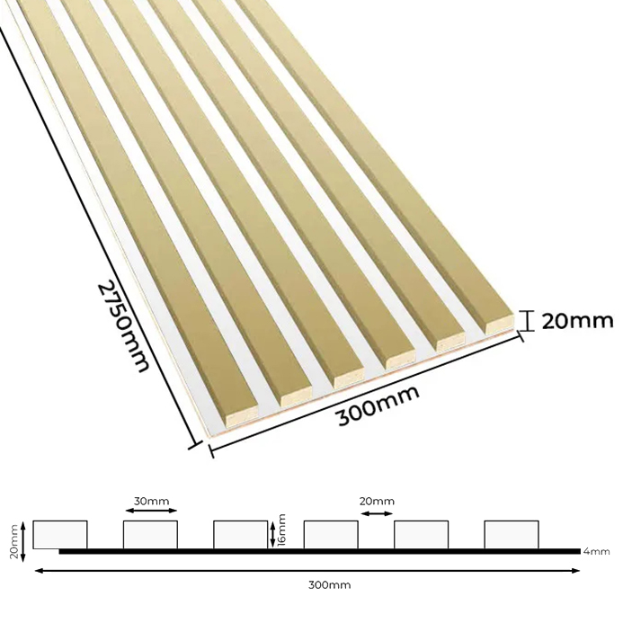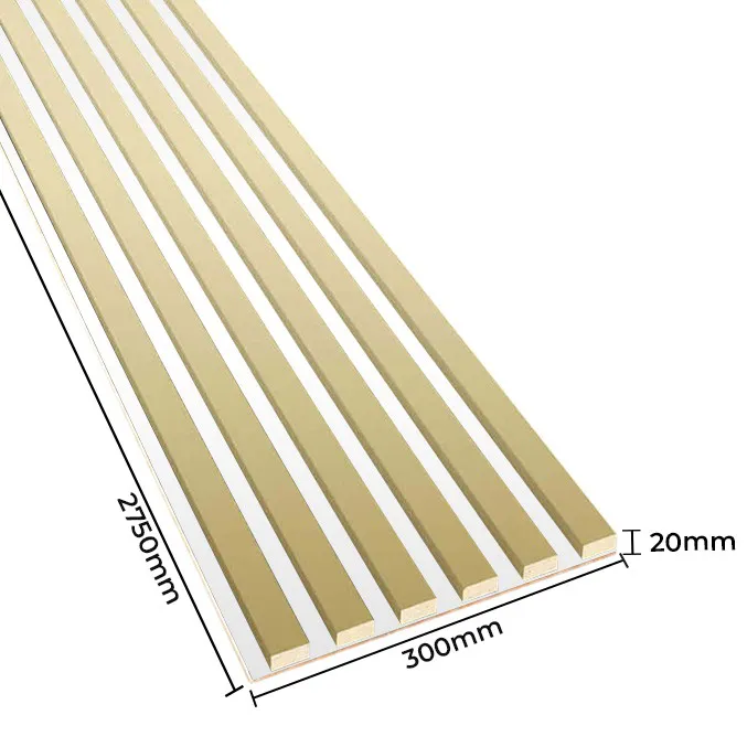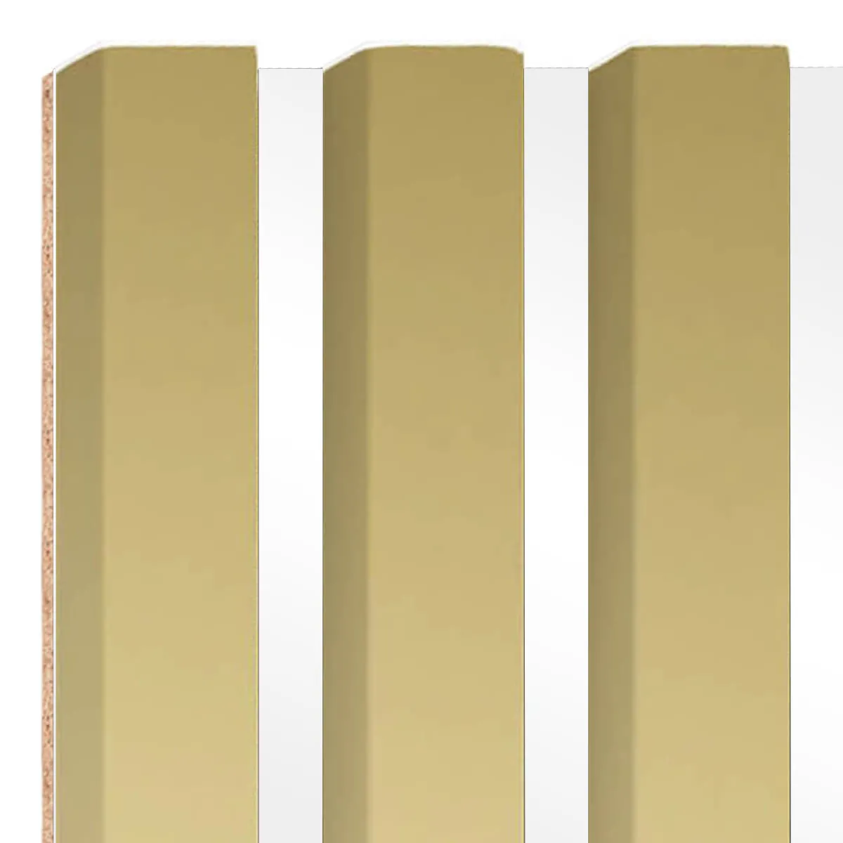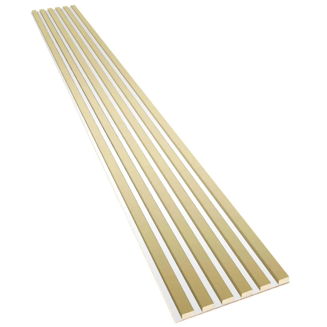 Lamele w kolorze szczotkowanego złota osadzone na białej płycie HDF to kwintesencja luksusu w gotowej do montażu formie. To połączenie gwarantuje spektakularny efekt wizualny: białe tło optycznie powiększa i rozświetla pomieszczenie, podczas gdy złote profile nadają ścianie biżuteryjnego charakteru. Idealnie sprawdzą się jako dominujący akcent w salonie, luksusowe wezgłowie łóżka lub reprezentacyjna dekoracja w przedpokoju.