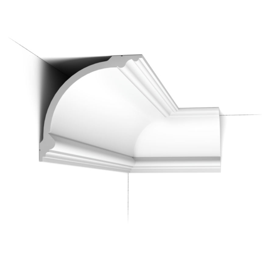 Listwa przysufitowa Orac Decor C338 to jeden z najbardziej okazałych gzymsów w ofercie producenta, zaprojektowany z myślą o prestiżowych wnętrzach o dużej skali. Model ten wyróżnia się głębokim, płynnym profilem wklęsłym (typu cove), który został wzbogacony o wyraziste, schodkowe detale na obu krawędziach. Przy imponujących, symetrycznych wymiarach – 18,2 cm wysokości oraz 18,2 cm szerokości – listwa tworzy potężną, harmonijną ramę, która definiuje luksusowy charakter wysokich apartamentów, rezydencji i przestrzeni reprezentacyjnych.